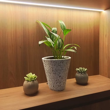 Pemasangan wadah tanaman memanjang (planter) sebagai alternatif estetik untuk pembatas ruang atau dekorasi di atas kabinet.